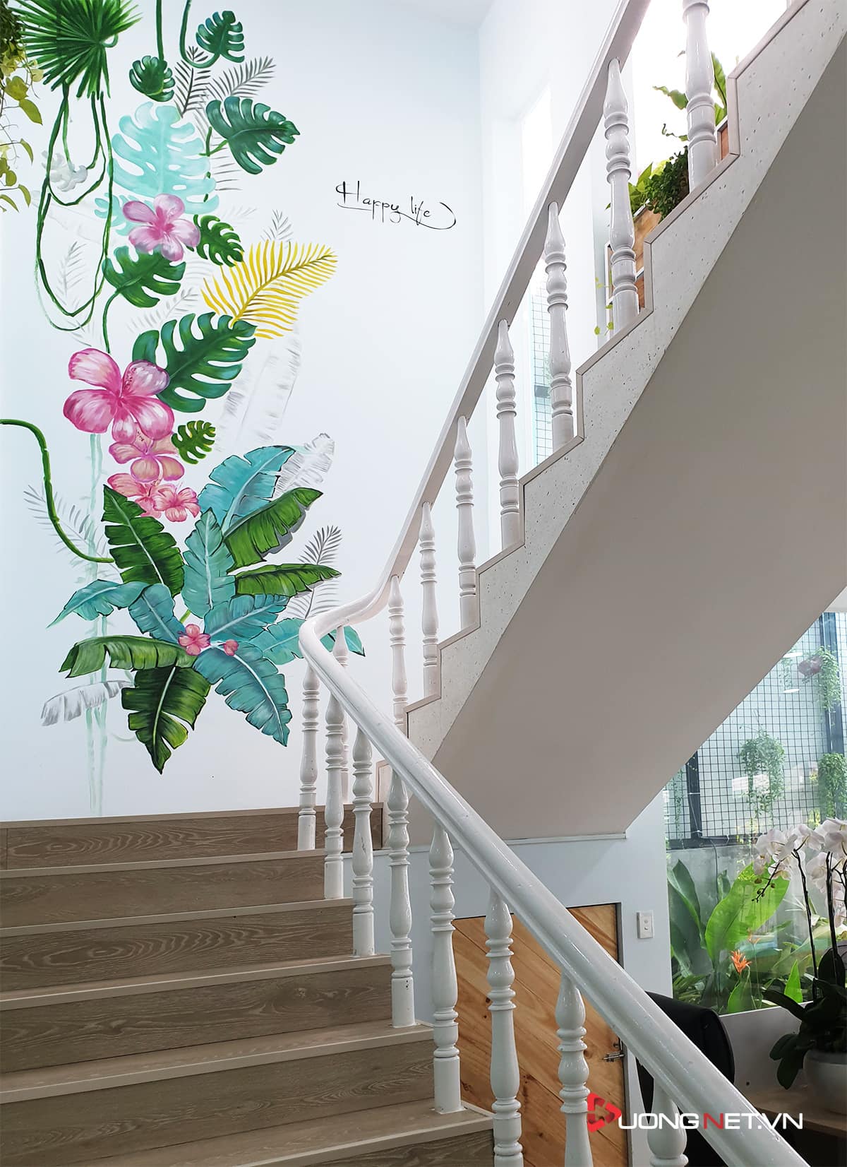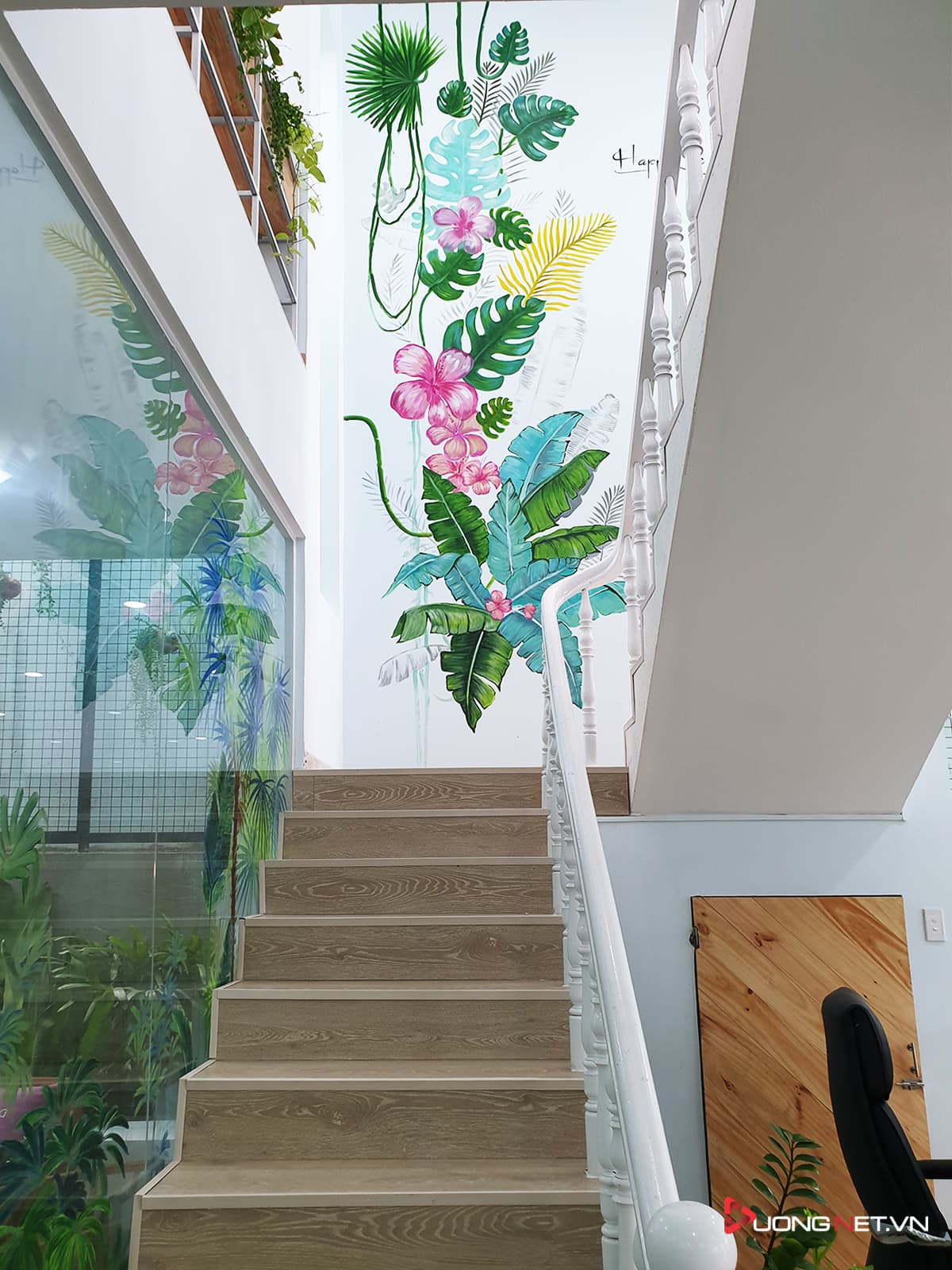 Cầu thang dẫn lên lầu 1 được trang trí bằng những hình vẽ vui tươi, sinh động.